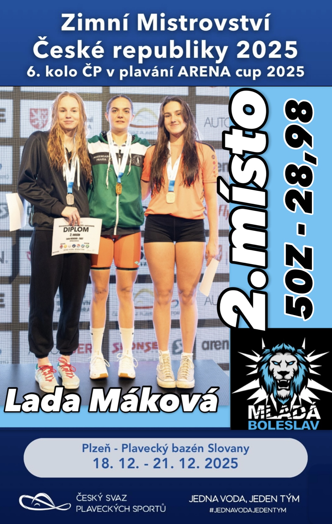Ve dnech 18.–21. prosince 2025 se v Plzni uskutečnilo Mistrovství České republiky v plavání dorostu a dospělých, nejvyšší domácí vrchol sezóny. Mladoboleslavský oddíl zde měl početné zastoupení a naši plavci se v silné konkurenci rozhodně neztratili.