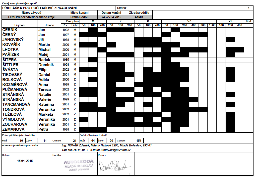 Prezentace (výdej startenek) ve vestibulu zimních šaten od 14:30. Úhrada startovného v sobotu ráno.